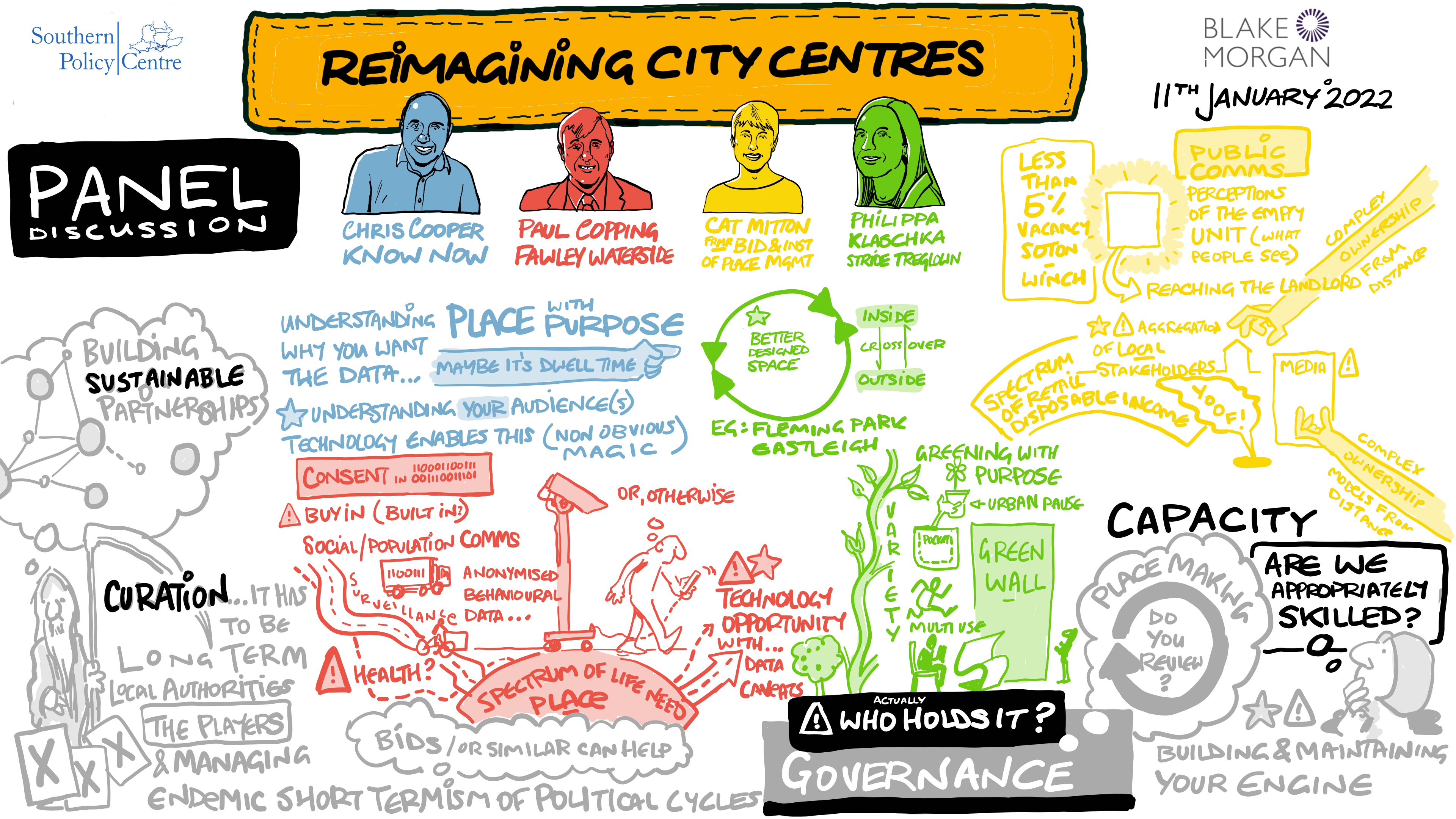 The pandemic is not yet over, and much has continued to change in our economy and communities in the 14 months since SPC’s city centre report. In early January 2022 we took the opportunity to revisit the topic, bringing together four speakers and an audience of around 60 people from across the businesses, organisations and institutions of the central South to discuss how city centres continue to change.